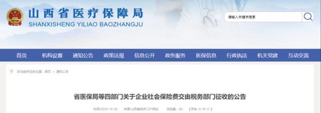 10月30日 北京、上海、山東、山西、湖南、四川、貴州、吉林、江西等地同時(shí)發(fā)布了《關(guān)于企業(yè)社會保險(xiǎn)費(fèi)交由稅務(wù)部門征收的公告》的通知。