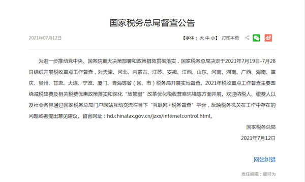 7月12日,國家稅務(wù)總局發(fā)布督查公告,涉及18個(gè)省份。